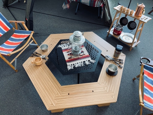화로 테이블은 상판 중앙부분이 뻥 뚫려있어서 거기에 화로대를 놓을 수 있는 테이블 입니다. 제가 캠핑다닌지 얼마 안 된 시절에는 고기를 한쪽에서 따로 구워서 테이블에 옴겨서 먹었었는데 그러다보니 테이블에 앉아서 먹는사람들도 있고 고기 굽는 화로앞에 서서 먹는사람들도 있고 그래서 뭔가 정신 없어 보이고 술잔이나 밥공기를 들고 왔다갔다 하는 모습을 보다가 문득 고기집처럼 테이블에서 고기를 구워먹으면서 여유있는 느낌의 캠핑을 즐길수 없을까 해서 찾아보니 화로 테이블이라는게 있는걸 처음 알았습니다.